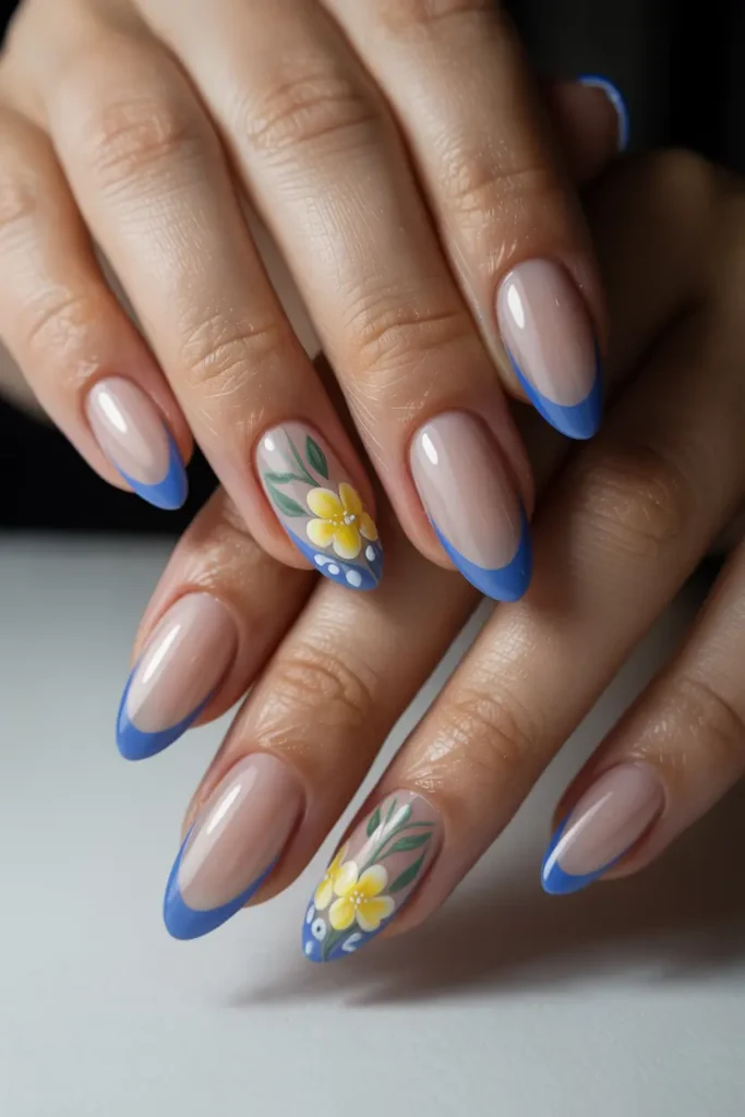 Almond French Tips with Blue Edges and Yellow Floral Accents