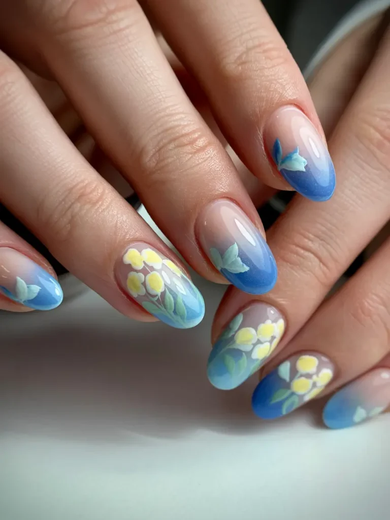 A blue gradient from dark to light paired with soft yellow floral accents creates a dreamy and artistic holiday design. This ombré effect combined with hand-painted flowers gives your nails a delicate yet bold appearance.