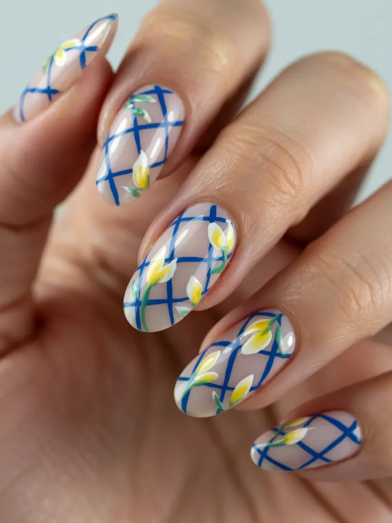 A more intricate design, this combination of blue ribbon art, grid patterns, and soft yellow florals creates a unique, detailed look. The nude base allows the design elements to pop, giving it a curated feel.