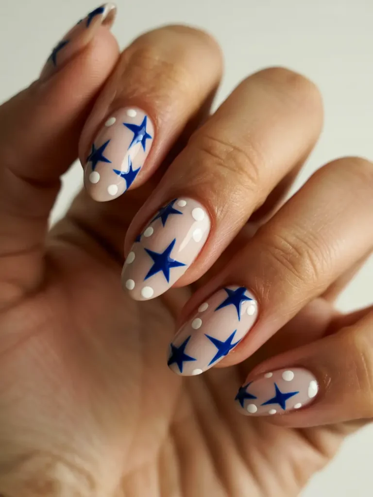 Almond Nails with Blue Star and Polka Dot Combination