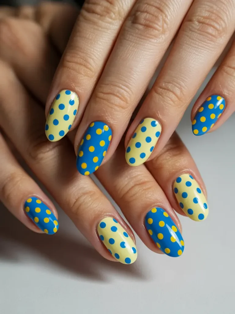 Almond Nails with Blue and Yellow Polka Dot Contrast