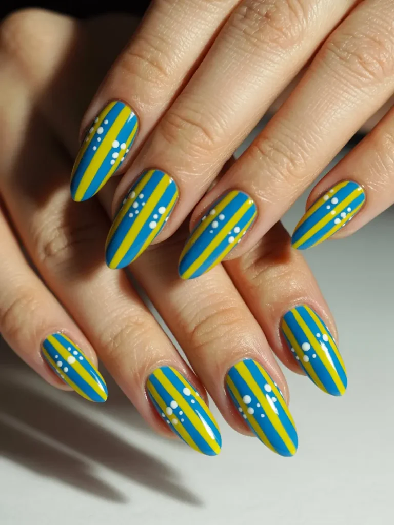 Long almond nails work perfectly with vertical stripes and dotted patterns. The blue and yellow stripe design enhances the elongation of the almond shape, giving you a sleek yet playful nail design.