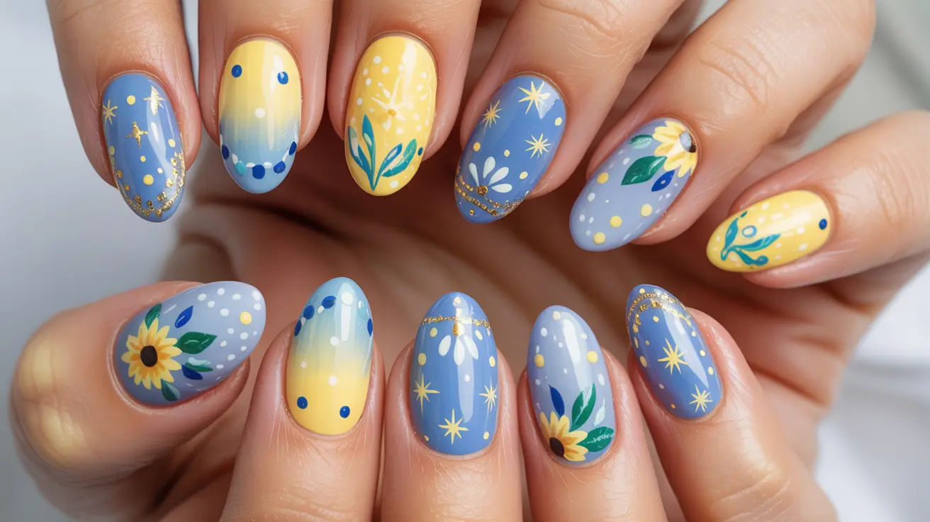 Almond Nails with Blue Gradient and Yellow Floral Accents