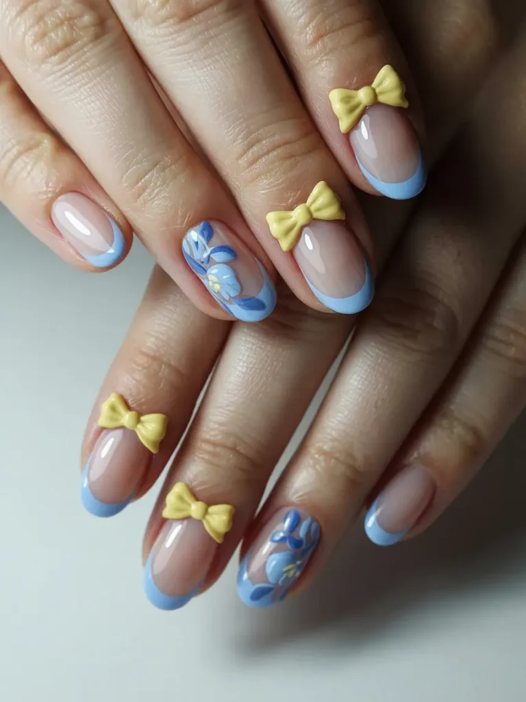 Short Almond Nails with Blue French Tips and Yellow Bow Accents