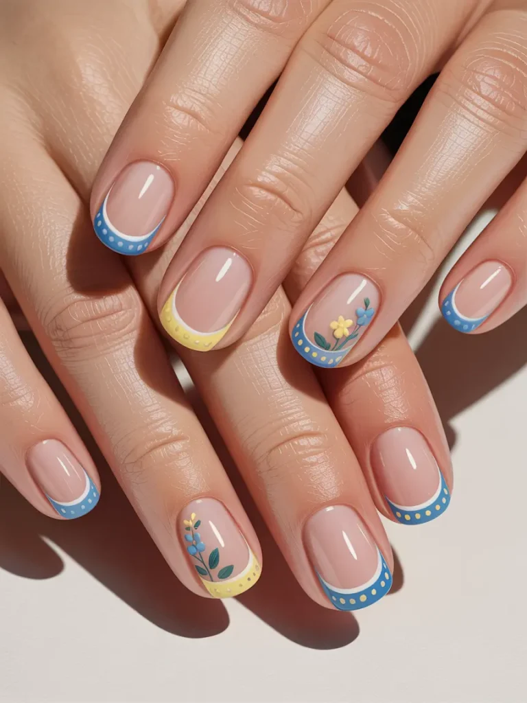 This design offers a fresh take on the classic French manicure with alternating blue and yellow tips. Tiny micro dots and a small floral detail add charm without overwhelming the design, keeping it simple yet festive.