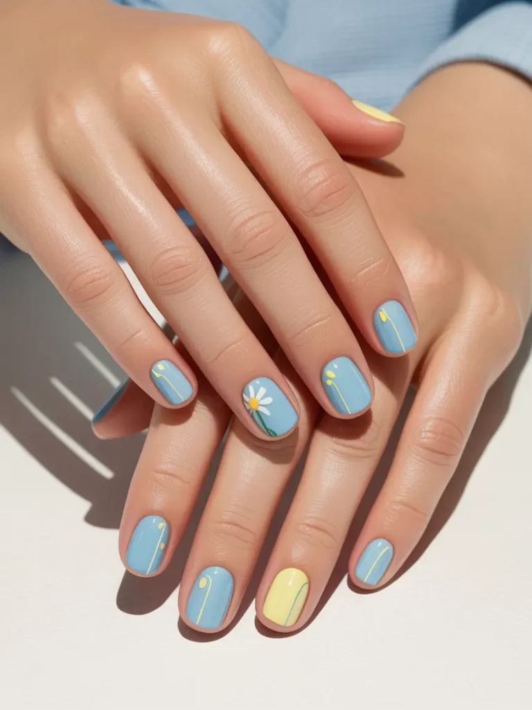 A minimalist design perfect for those who like their nails understated. This combination of sky blue and soft yellow tones creates a balanced, modern look. A subtle floral accent nail adds just the right touch of detail.