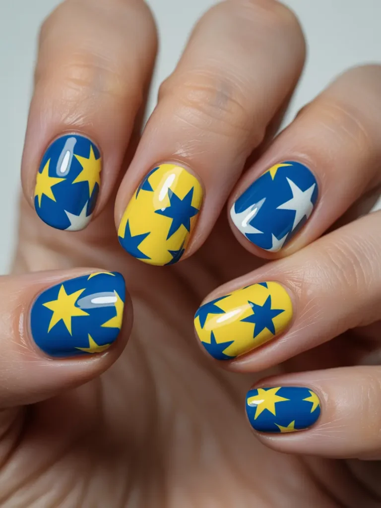 Stars are always a great choice for the holiday season. This design features alternating blue and yellow bases with star motifs on each nail, making them stand out in the best way.