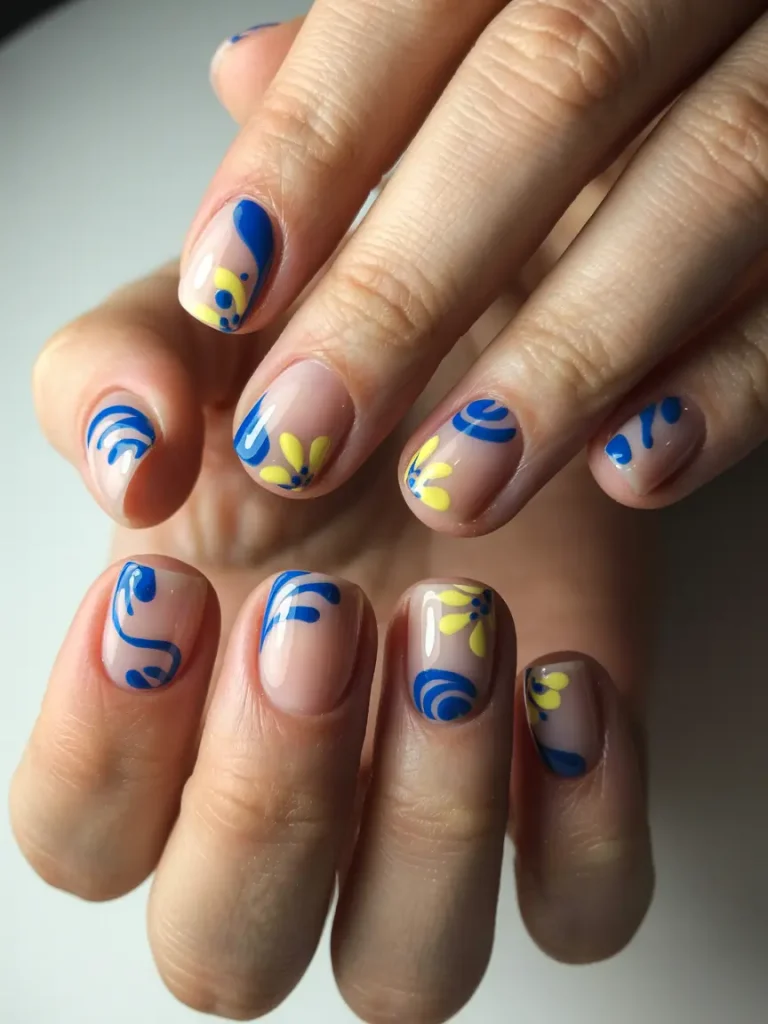 For a playful twist, short square nails featuring blue abstract accents and yellow floral designs will brighten up any holiday outfit. The design mixes glossy nude with bold and playful patterns, giving you a modern look with festive vibes.